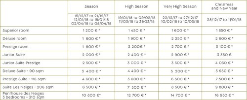 Suite Les Neiges (206 кв. м): двухуровневый номер. 2 балкона, гостиная с обеденной зоной и камином (стол на 8 персон), спальня, гардеробная зона, ванная комната с ванной и душем с функцией парной, массажный кабинет, джакузи. Дополнительно: кондиционер. Расположен на 6 этаже. Вид на горы, горнолыжный спуск и окрестности. Возможно объединение с номерами категорий Prestige room и Prestige junior suite. Услуги персонального камердинера.
