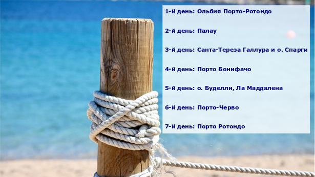 Ольбия Порто-Ротондо → Палау → Санта-Тереза Галлура и о. Спарги → Порто Бонифачо → о. Буделли, Ла Маддалена → Порто-Черво → Порто Ротондо